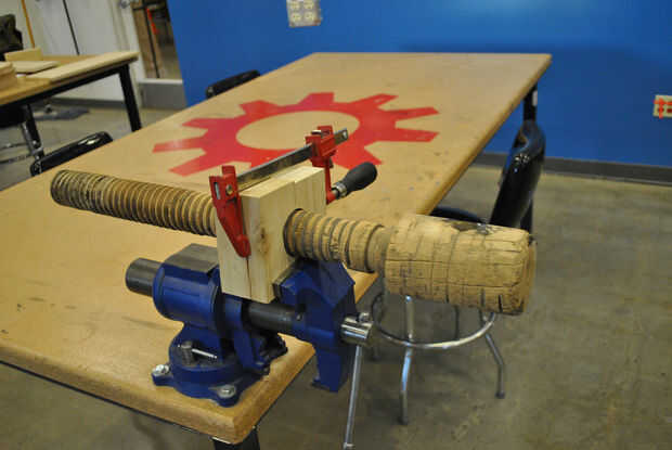 Se puede ir elegante con esta parte, usando cualquier forma de colas de Milano y espigas, pero todo lo que necesitas es un poco de pegamento para madera. La tuerca se ajusta a la pata de la mesa de trabajo suficientemente apretada que integridad estructural no debe ser un problema. Había planeado hacia abajo un poco más para mejor ajuste su rincón en el Banco.