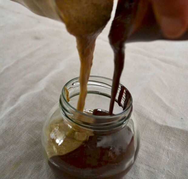 Vierta en el mismo momento en tu tarro, a la izquierda, uno a la derecha.