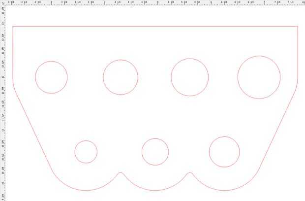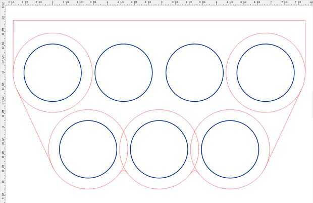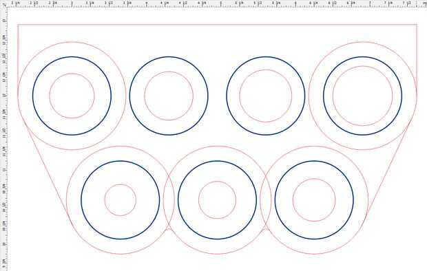 Ahora tenemos que crear el contorno de la base. Decidí que quería que los lados de la base de ser 0,2" más grande que los drivers de la tuerca. Así que dibujé una serie de 1,45" diámetro círculos alrededor de los conductores de la tuerca exterior. Dibujarlos en rojo con una anchura de la rayita para indicar que debe ser cortadas (no grabado) con el cortador láser. Entonces dibujé las líneas rectas (también rayita roja) para unirse a los lados y atrás. Entonces, para evitar las esquinas agudas del interiores he añadido dos pequeños arcos de 3 puntos para suavizar el encuentro de los círculos.