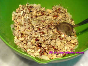 Tomar un bol grande y añadir todos los ingredientes secos. Por lo tanto, agregar semillas de girasol, linaza rota, semillas de chia, canela, blancos copos de almendra, avellanas picadas y anacardos picados. Mezclar bien con una cuchara.