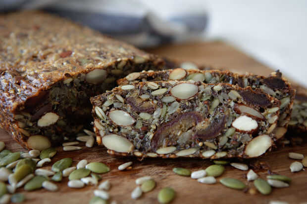 Una alternativa de fácil nutrientes pan denso hecha de almendras, las semillas y las fechas. Delicious en su el propios con el crujiente de frutos secos, semillas y natural dulzura de dátiles medjool, mejor aún cubiertas con semillas de sésamo y miel. Esta tuerca y semilla de pan puede ser cortado y congelado para un rápido desayuno saludable cada mañana durante la semana ocupada. Las almendras pueden reemplazarse con cualquier semilla preferida para mantener este pan de nuez gratis.
