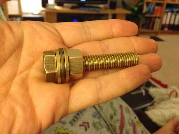 Finalmente colocar las dos piezas juntas y enroscar la tuerca. Utilizar un número adecuado de arandelas en la parte superior a la tuerca del espacio. Poner suficiente arandelas para que la tuerca no puede ser hasta demasiado lejos para revelar la división. Esto debe significar que la tuerca se coloca siempre sobre los recortes en el perno.