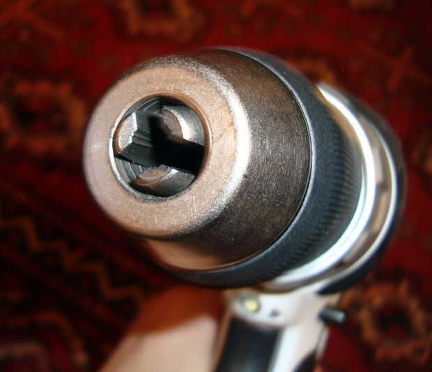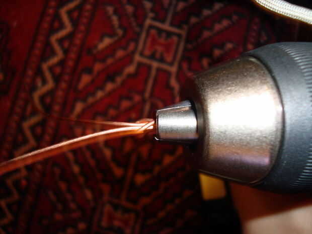 Coloque el gancho en la boca del taladro y cierre firmemente el taladro alrededor del alambre. (Mi taladro hace un chasquido cuando yo no puedo apretar cualquier aún más.)
