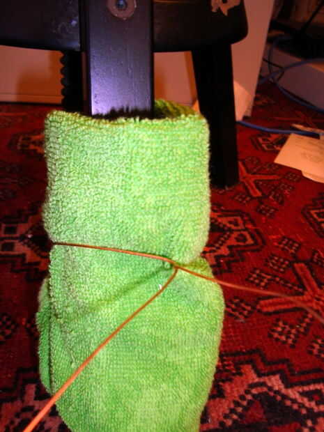 Tome una longitud de cable (yo usé aproximadamente 4 pies) y gire una vez alrededor de paño para obtener todo lo necesario para permanecer en el lugar.