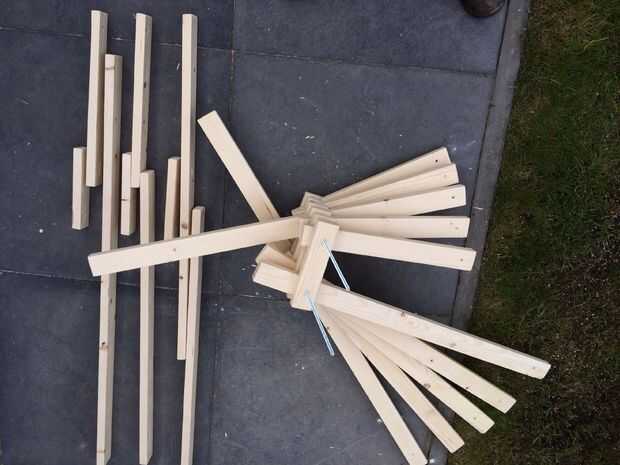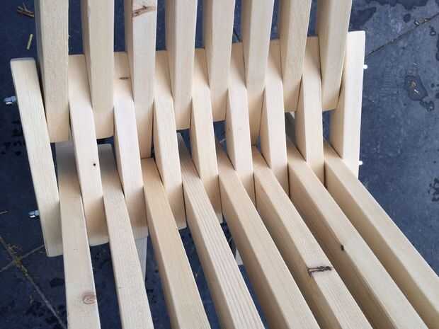 Daarna rijgen de het zitgedeelte en de rugleuning aan het draadijzer.