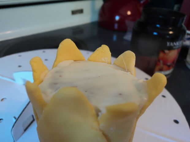 Necesita fondant color amarillo, naranja y verde. Para colorear el fondant, poner unas gotas de colorante en el medio de algunos fondant y luego lo amase en una superficie cubierta. Naranja, poner unas gotas de colorante rojo y unas gotas más de para colorear amarillo y amasa. Se pegan los estallidos en styraphoam o en un soporte de exhibición de pops. Para hacer los pétalos, extienda el fondant amarillo a un poco más delgados que 1/4" sobre un mostrador o superficie plana que ha sido espolvoreada con azúcar en polvo. Corte formas de gota de agua de la masa, aproximadamente del mismo tamaño y palo con derritieron caramelo en el pop de la torta, para que el lado más grande es cerca de la palanca y el punto se está pegando hacia fuera sobre la parte superior. Pétalos se tocan mutuamente. Añadir otra capa de pétalos, colocándolos para que cubren el lugar donde se encuentran los primeros pétalos. Aplanar las puntas de los pétalos para que los puntos son menos afilados.