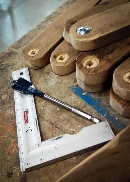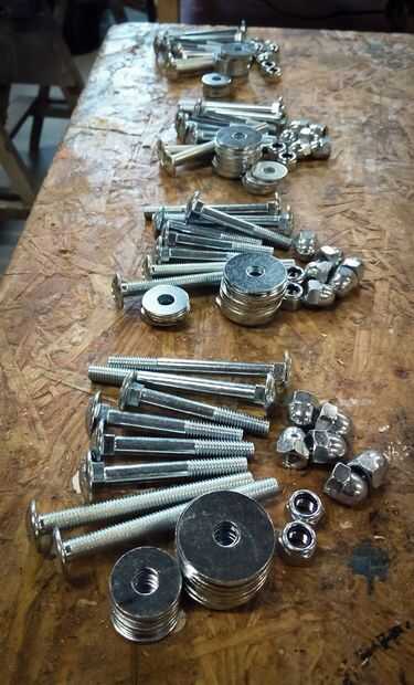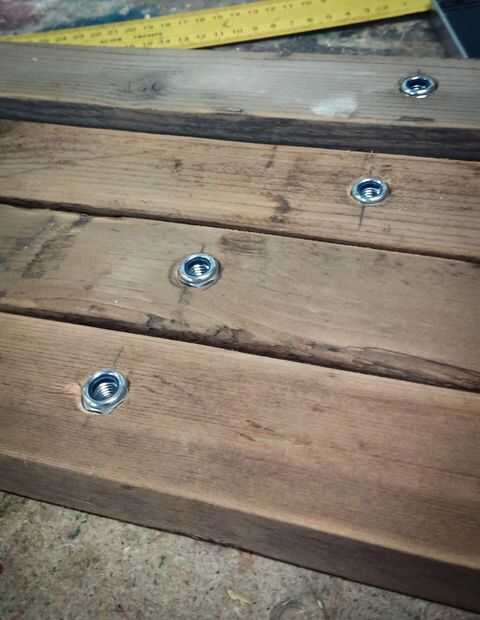 Utilice una broca especial para hacer espacio para las cabezas de los pernos y las tuercas dentro de la madera, especialmente donde hay tableros adyacentes. Usé un poco de 22mm para las tuercas guest y poco de 26 mm para hacer espacio para los pernos de cabeza.