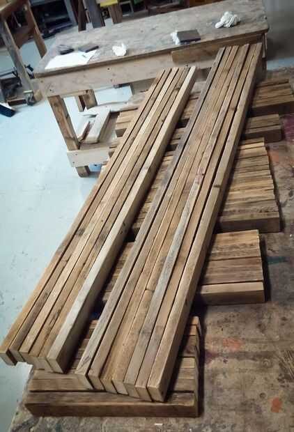 Opté por tableros de madera antiguos procedente de un techo viejo Italiano, probablemente son 80 años de edad. Yo les enarenado y cortar a la longitud correcta.