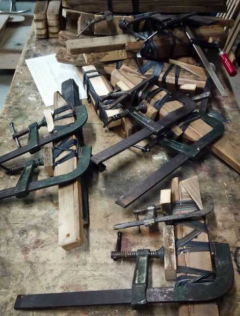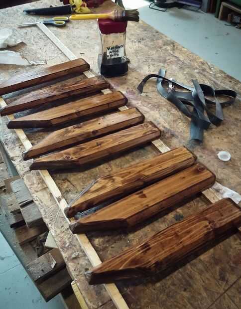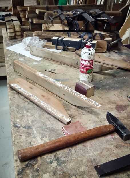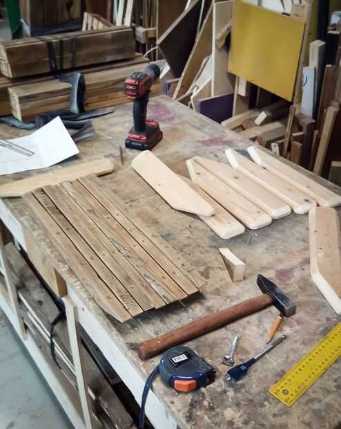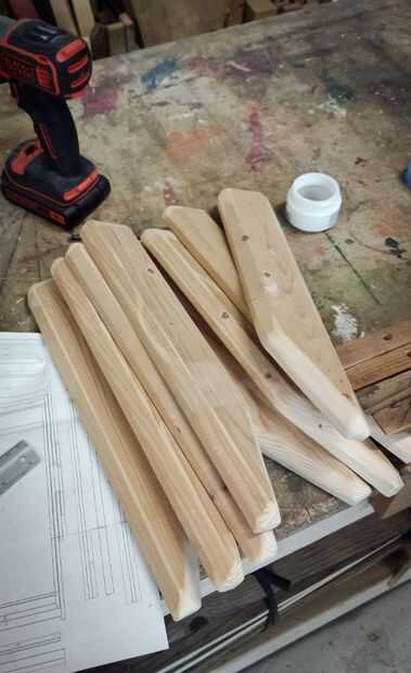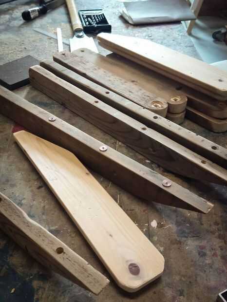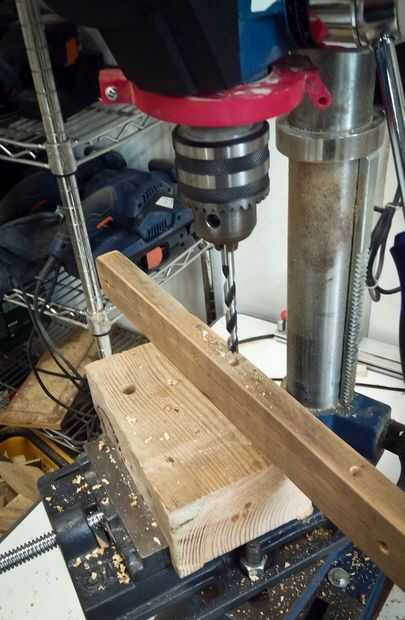 En las fotos que se puede ver que corte los brazos de algunos tableros de madera, alisa los bordes de la superficie superior, taladré orificios para tacos en los soportes, todo con mordente de nogal había pintado y pegado soportes y brazos con pegamento vynilic.