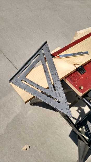 Para las patas traseras, gancho agarrador el 32" largo piezas se arrancó solo. Como se puede ver arriba, usted necesitará marcar un ángulo de 20 grados con el cuadrado de la velocidad. El lápiz está apuntando a donde mides los grados. En el otro extremo, marca un triángulo de 1 "x 3". Estos cortes son fáciles de hacer a mano alzada. También puede sujetar su cuadrado de la velocidad a la Junta si usted está tan inclinado.