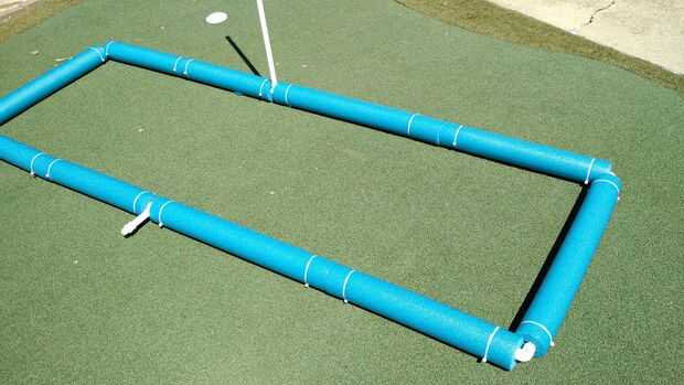 Después de que el marco era bastante seco, empecé a cortar los tallarines de la piscina y fijarlos en el PVC. Para hacer esto, mida la longitud necesaria de los tallarines de la piscina en el lugar va, cortar los fideos en un círculo con el cúter, luego cortar un bosque en los tallarines con el cortador. Coloque los tallarines en el PVC y asegúrelo con dos abrazaderas de plástico por pedazo de los tallarines.