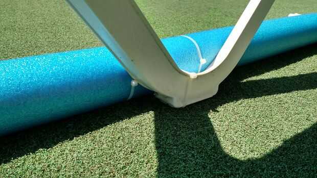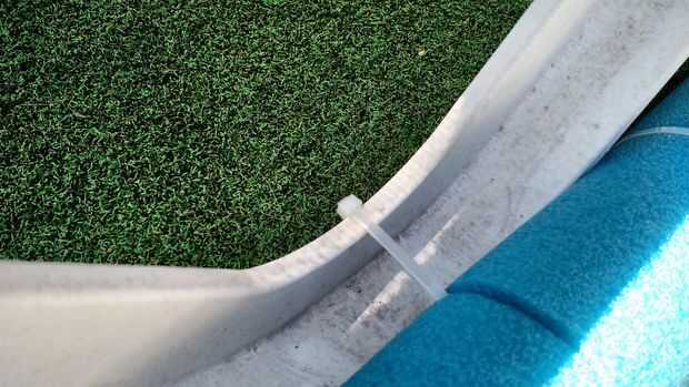 Después se construyó la flotación primaria, conecté la tumbona a la flotación con los mismos lazos zip como antes. Cada pata de la silla está vinculado al marco del PVC en las ubicaciones predeterminadas.