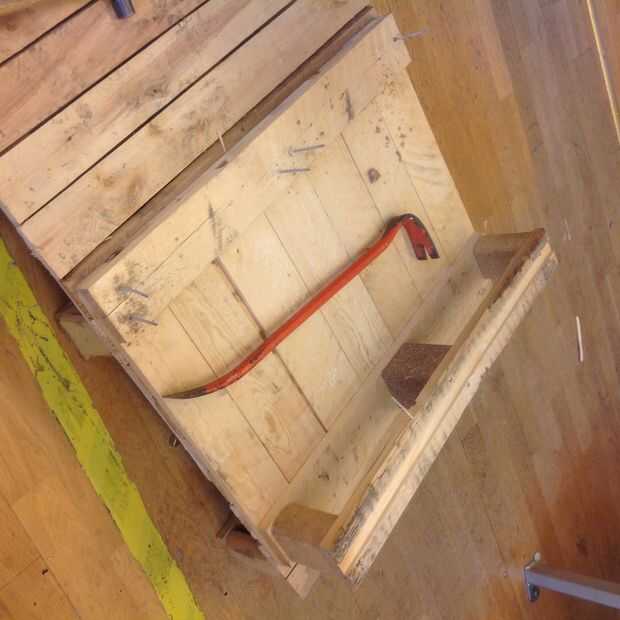 de viejos palets encontradas una fábrica de metal de hoja, una silla simple fue hecha usando sólo tres palets viejos. Con unos simples cortes de las ranuras de la tumbona en una forma muy estable. Alll que se fue un poco de lijado, seguido de tres ca