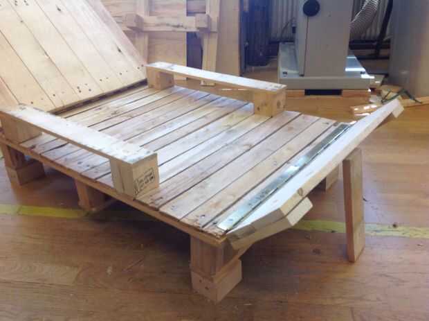 de viejos palets encontradas una fábrica de metal de hoja, una silla simple fue hecha usando sólo tres palets viejos. Con unos simples cortes de las ranuras de la tumbona en una forma muy estable. Alll que se fue un poco de lijado, seguido de tres ca