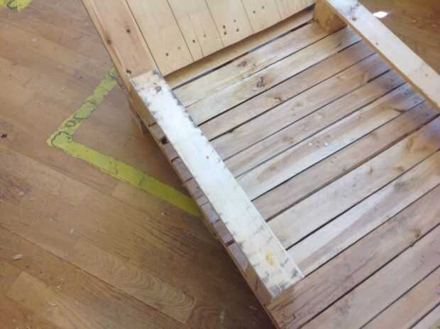 de viejos palets encontradas una fábrica de metal de hoja, una silla simple fue hecha usando sólo tres palets viejos. Con unos simples cortes de las ranuras de la tumbona en una forma muy estable. Alll que se fue un poco de lijado, seguido de tres ca