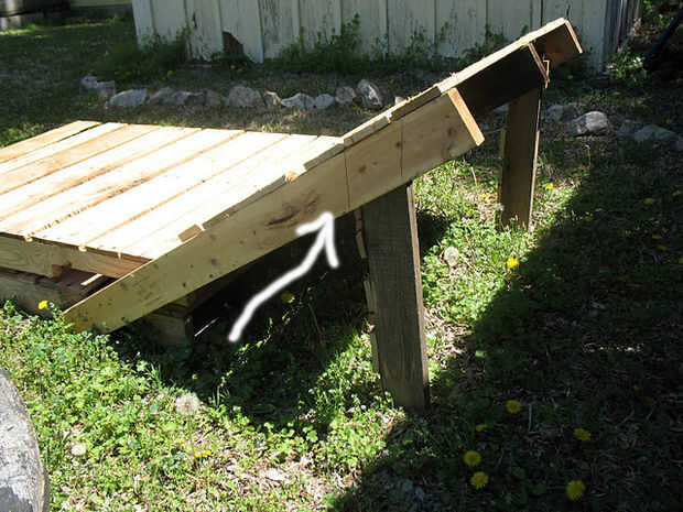 Apuntalar su respaldo hasta donde quiere que vaya a determinar cuánto de una pendiente se desea el volver a ser. Marqué la inclinación de las piernas favorables del lado, así que sabía en qué ángulo para sujetar las piernas más adelante (ver foto con la flecha). Sólo reutilizar las tablas medianas originales (2x4s) de mi plataforma de respaldo para esto y en este punto estaba tan cansado y caliente que me aún no preocupa limpiar :) Apenas será visibles al final de todos modos. Ah, y os adjunto las patas de apoyo para el respaldo en este momento demasiado :)