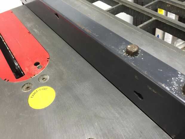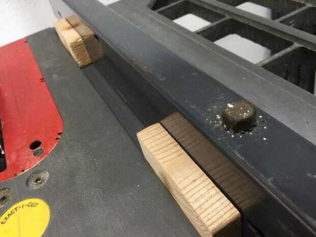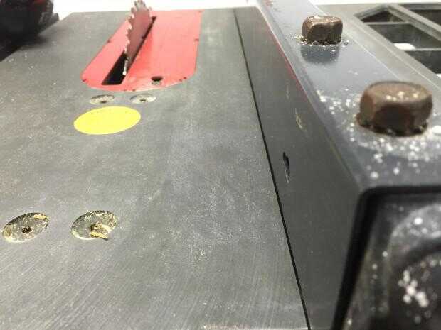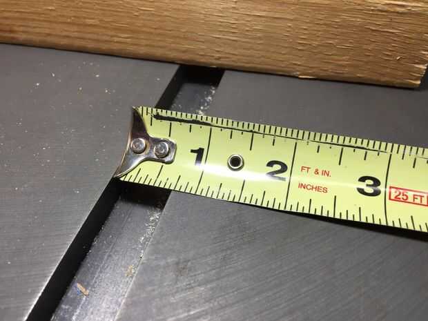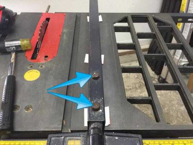 Si hay cualquier variación en esta brecha, necesita ajuste fuera de la cerca. Mi sierra tiene dos pernos sobre la guía que puede aflojar, ajustar y apretar para cambiar el ángulo de la valla. La sierra puede ser diferente, así que una vez más, consulte su manual del propietario para el procedimiento exacto para la sierra.