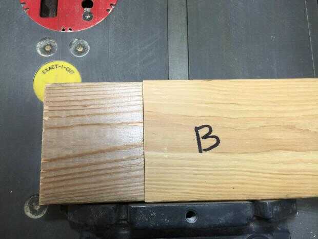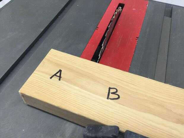 A continuación, marque una pieza de 2 x 4 con una A y una B para una letra a cada lado de la corte transversal que harás a continuación.
