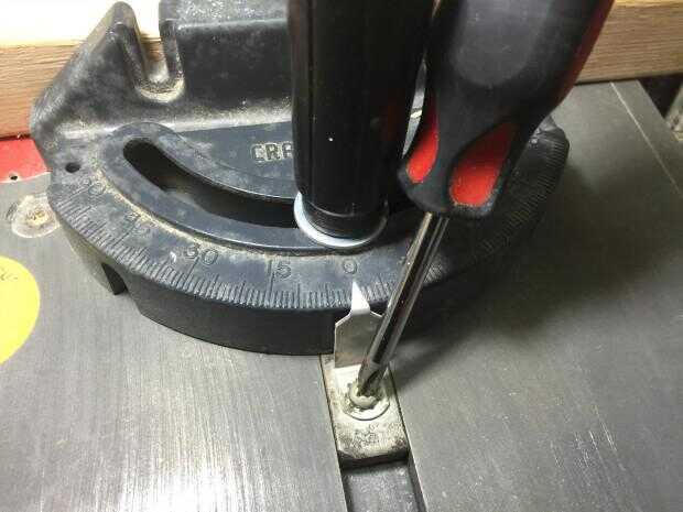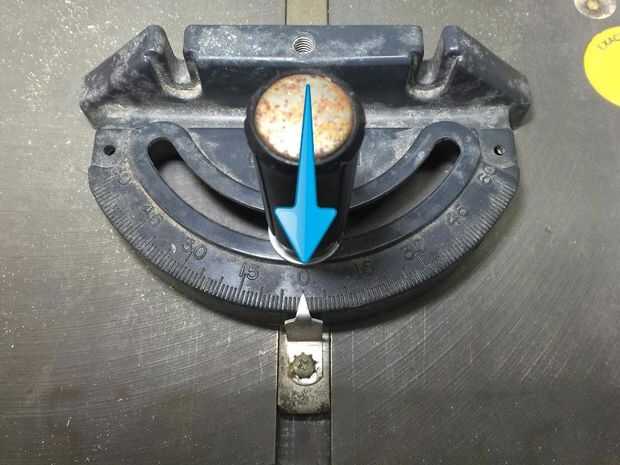 Ajuste el calibre de ingletes para que la aguja está perfectamente en 0, que indica que es perpendicular (90 grados) a la hoja.