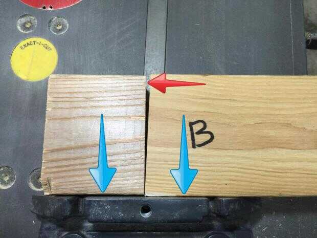 Presione ambas piezas contra el calibre de ingletes y comprobar por una brecha en la costura entre ellos. En esta foto, se puede ver que existe un vacío en la parte superior. Esto indica que el calibre de ingletes debe ajustarse ligeramente hacia la izquierda en un ángulo exacto de 90 grados con la cuchilla.
