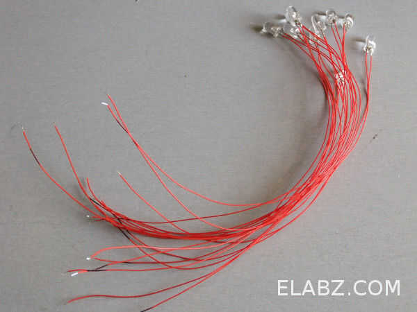 Los LEDs necesitan tener sus terminales recortadas a aproximadamente 3/16"(5mm o menos). Una vez hecho, perder la marca de polaridad que es el hecho de que uno de los conductores es más larga (ánodo). Entonces se tiene que marcar que los cables con un rotulador para indicar que el ánodo. Supongo que se puede utilizar remolque color diferentes hilos pero, una vez más, rojo es mucho mejor que cualquier otra cosa de la caja transparente, por lo que es mejor que el tanto rojo.