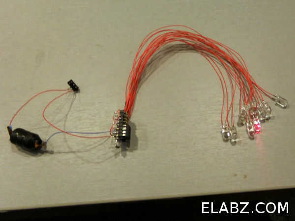 Una vez que todos los 10 LEDs (o 12 - la máxima cantidad de LEDs apoyado por Charlieplexing de 4 pines de I/O) se sueldan, soldadura de la batería y el interruptor. Decidí que tienden a desordenar la polaridad y utiliza un cable azul para la conexión a tierra de la batería. Es el cable rojo no sólo en todo el proyecto que hace que sea fácil de identificar. El cilindro de calor reducido con tres pilas LR44 y tiras de latón en cada lado resultó para ser una forma inconveniente de proporcionar la energía de la batería. Por desgracia, batería accionado por resorte cajas para baterías de tablet son algo raras y me alegré de que mi perro mastica encima de un juguete que tenía uno, así que he hecho de nuevo la batería antes de hacer el video, es por eso mis baterías son diferentes en el video y esta foto.