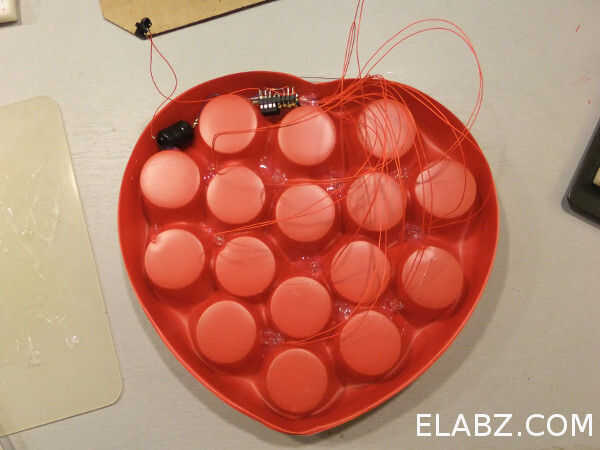Saque el inserto de plástico rojo de la caja y darle la vuelta. Luego coloque la parte más grande junto a la llanta, donde cuenta con más espacio. Utilice la pistola de pegamento caliente para pegar la batería y el portador de la MCU en el lugar. Tenga en cuenta la posición del interruptor de inclinación de la bola: Si el cilindro del interruptor es casi exactamente paralelo al plano de tierra, será extremadamente sensible. Terminé haberlo colocado como ése (por casualidad) y no podía caminar más allá de la mesa de que los chocolates están en sin salir de los LEDs. Si es la sensibilidad que estás buscando, como objetivo para la colocación horizontal. Sólo tener en cuenta que la duración de la batería puede disminuir por LEDs parpadeando a menudo.