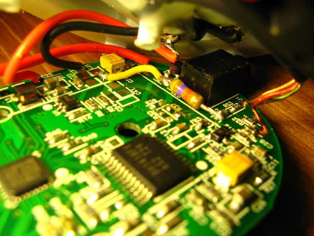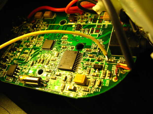 Agregar el resistor de pull-up a entre C52 y Vcc. Es el cable amarillo conectado C52 y probado con aproximadamente 40 resistencia de ohmios k. Cerca de C20 es lugar de soldadura gratis conectar otro extremo del resistor de pull-up a Vcc