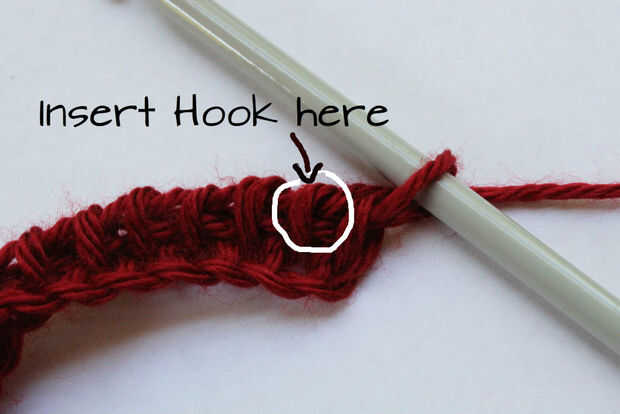 Ahora básicamente vas a hacer lo mismo que hiciste en el comienzo de la fila 1, pero ahora los lazos en que te vas a insertar el gancho el lado frente a usted, no sobre la parte superior. Parecen más a pequeñas escalas. Inserte el gancho en uno, hilado sobre tire un lazo y seguir haciendo todo el camino hasta el final de la fila.