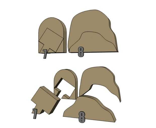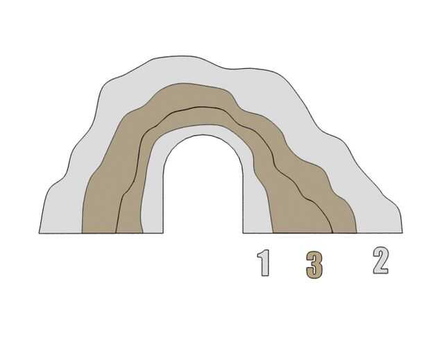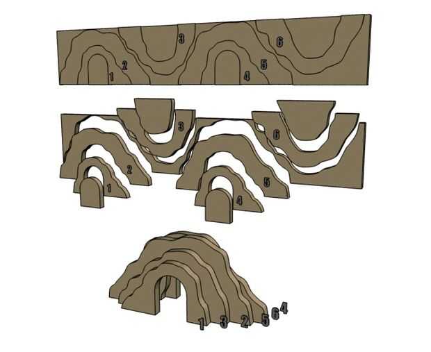 El túnel consta de 6 piezas apiladas y pegado, pero realmente los más importantes son el frente y la espalda ya que son la entrada del túnel y la salida. la medida 1 3/4" desde el borde largo de la Junta de 6" desde el extremo y dibuja un círculo de diámetro de 2" en ese momento y cortar ese trozo. Una vez que la entrada es corta, corte a mano alzada una balanceo forma Arca al azar alrededor de esa línea no menos de aproximadamente 1/2" de la puerta corta (véase pieza #1 más abajo). A continuación hacer aún mayor balanceo al azar forma de arco dejando aproximadamente 1" de material (ver pieza #2 abajo). La siguiente pieza es el difícil, como usted quiere asegurarse de que usted superponen la costura entre la pieza #1 y #2 más o menos uniformemente para que pueda apilar y pegamento, la segunda imagen de abajo puede dar una idea de cómo cortar la pieza #3. Ahora, toma tus 3 primeras piezas y utilizarlos como plantillas para hacer un duplicado de cada uno (o usted puede cortar 3 los totalmente diferentes con el mismo procedimiento si desea).