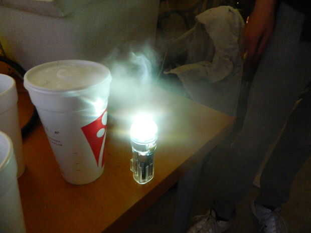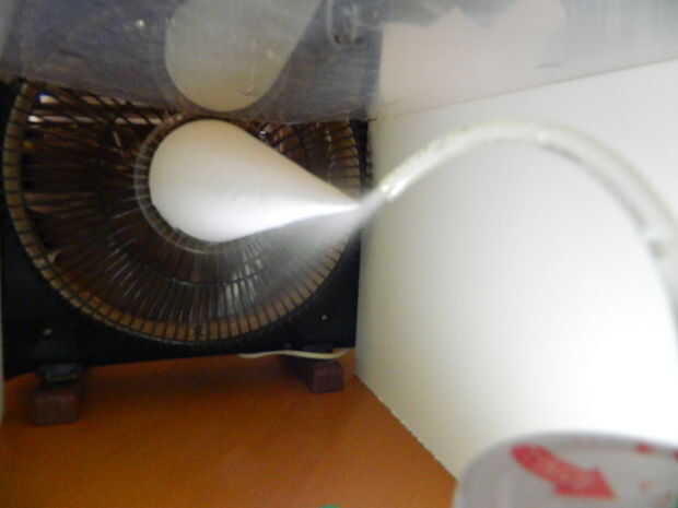 En estas secuencia de imágenes, experimentó con tres cosas, la herramienta de visualización de flujo, los fans sin restricciones con los deflectores ido y el cono de papel de construcción que elimina el espacio muerto y la turbulencia de la ingesta. Hemos podido concluir que el pesar de las modificaciones de ventilador ayudó a aumentar el flujo y velocidad del flujo de salida, podría ser más refinado con un cono largo y conector ventilador y túnel herméticamente. La visualización del humo demostró para ser ineficaz con un tarro de cristal ya que el hielo fácilmente congelaría el contenedor y nos temíamos lo rompiendo la jarra entera. Esto condujo al desarrollo en el uso de vasos de espuma de poliestireno que son aislantes y menos probable que pierda el frío por conducción.