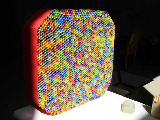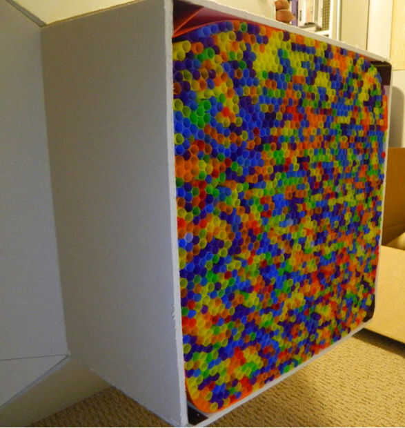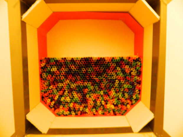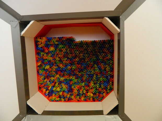 Hacer la matriz en forma de panal tomó absolutamente un rato. Acabé pasando que yo diría 8 o más paquetes de pajitas. Me corte las pajillas en tercios en secciones de 7cm aproximadamente y línea para pegar. Puesto que había literalmente unos pocos miles de pajas para cortar, no me molesté lo que es terriblemente exacta, compensando haciendo que los gases de escape de la línea de paja uniforme pero no la ingesta (ver imagen 2, la imagen trasera vs 6, la parte delantera). Capa sobre capa, poco a poco pegado la paja junto con Elmers pegamento y eventualmente resultó en una matriz que se veía hermosa. Esta matriz fue diseñada para encajar en el conector entre la ingesta y la sección de prueba.