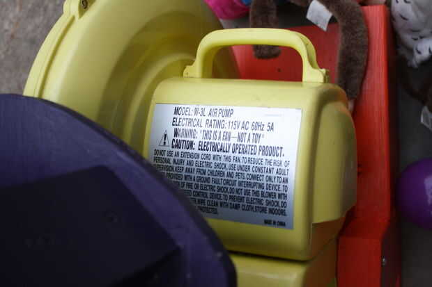 Inicialmente trató de alimentar el túnel de viento con dos ventiladores, pero no movieron casi suficiente aire para poder divertirse. La bomba de aire para nuestra casa hinchable mueve el aire, además de que tiene una pegatina gigante etiquetado como "no es un juguete".