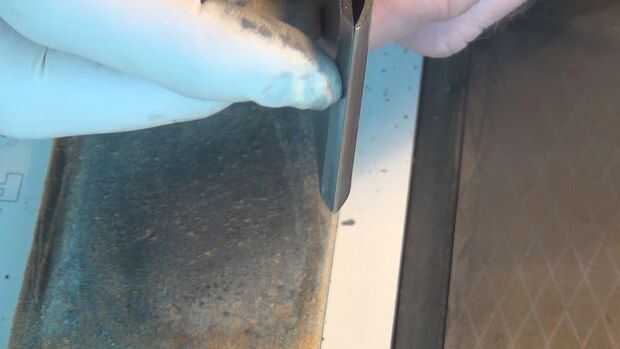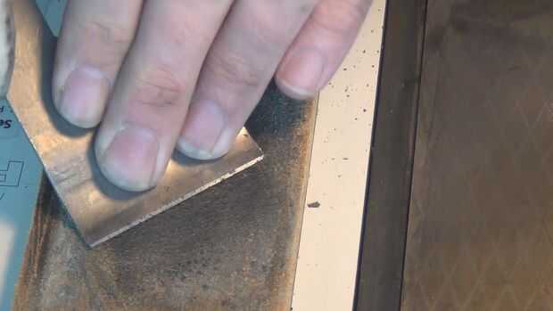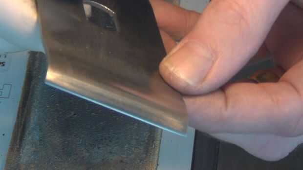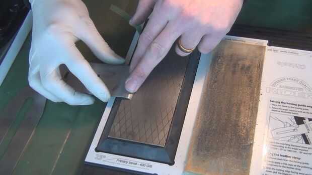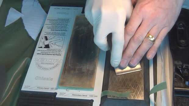 Primero preparar la parte inferior en la punta, de manera que la punta extrema toca la plancha primero, colgando de la cola inferior de la piedra mientras se trabaja. Seguir trabajando hasta que esta zona es plana, para contacto en toda la anchura.