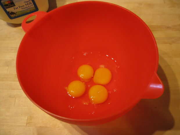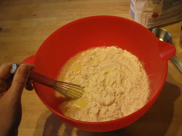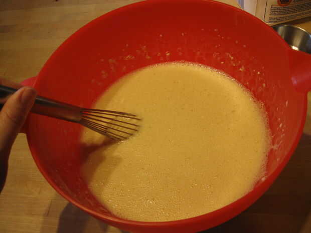 Batir los huevos, batir en la leche, batir la harina. Usted debe tener una masa bastante fina, un poco más gruesa que batir, sin muchos grumos (aunque algunos bultos son aceptables).