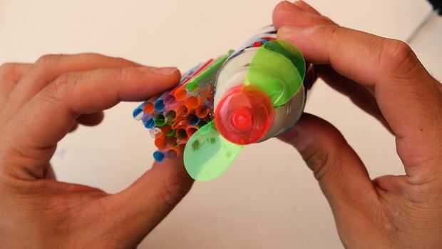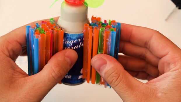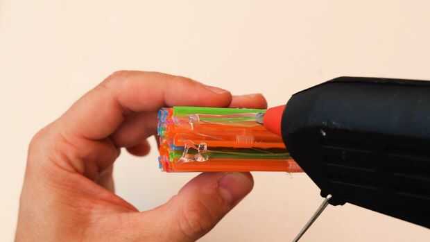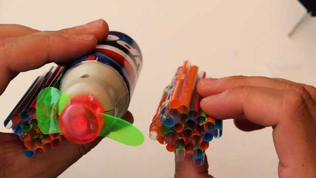 Tomé la pistola de pegamento caliente y había pegado las paja conexiones para el ventilador del centro.