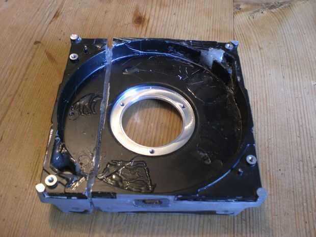 Monte el motor de disco duro en la caja pegados juntos. La placa trasera en el pegamento.
