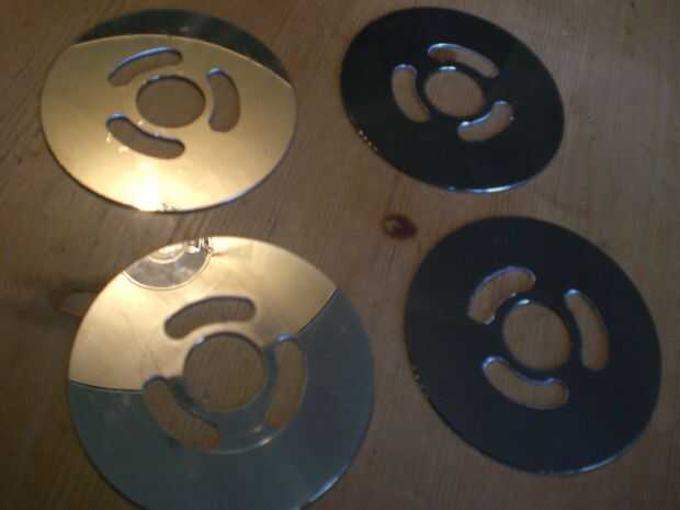 Unirse los agujeros para que se formen 3 ranuras iguales usando un archivo de agujero. Terminar cada ranura curva con una lima de media caña. Montar el disco en una madera revestido de vicio y trabajar lo más cerca posible al borde del vicio. Tenga cuidado de no doblar la pieza de trabajo.