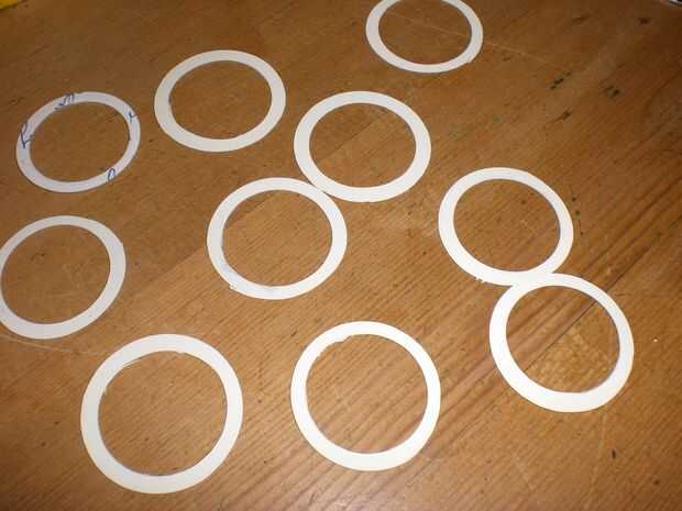 Así, usando el cortador del agujero, corte al menos 12 arandelas con radio interior 15mm y radio de outter de 20mm.