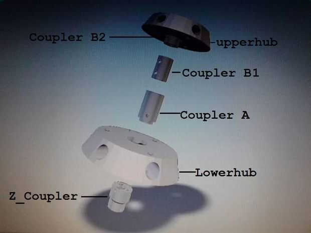Nota el Lowerhub es más grande que el cubo superior. Esto se hizo en la turbina original de-1 para puntales de bambú. El tamaño del núcleo depende del diámetro de puntales usados. El original-1 utiliza 15 milímetro diámetro puntales aprox 18" de largo. Puede reducir la longitud de los puntales para ahorrar peso.