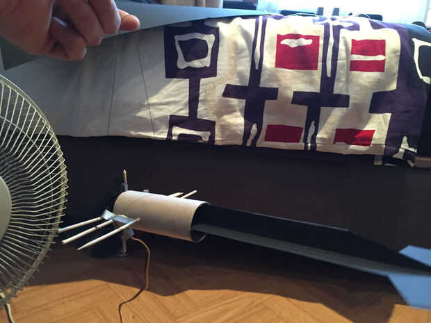 Hemos utilizado un ventilador separado para crear el flujo de aire para probar cómo se comportaría cuando sería aerotransportado (casi sin viento fuera el día de la prueba). También, la idea hecha aire era simplemente colocar globos de helio sino esto no encajaría dentro de nuestro presupuesto (estudiante). El helio es más caro después que esperábamos.