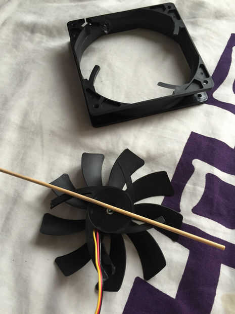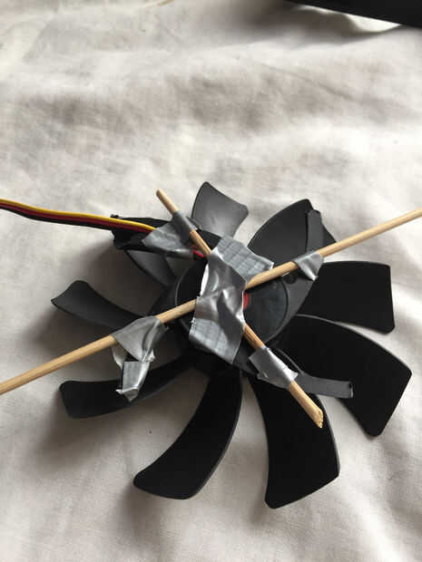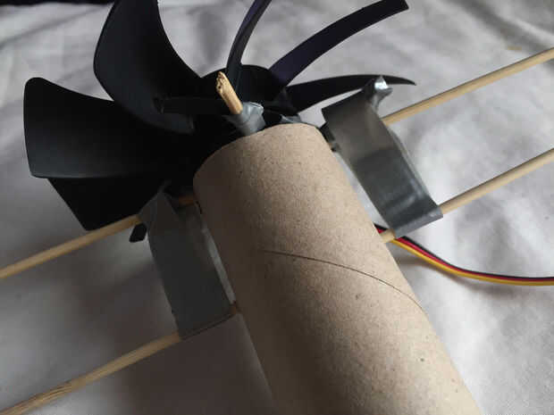 Ahora que hemos tenido un generador de trabajo creamos una construcción rápida para fijar el ventilador a un tubo de papel higiénico. Adjunto algunas piezas de un pincho en la parte trasera del ventilador y empuje uno a través del tubo, utilizar un cuchillo pequeño para crear dos pequeños agujeros para que la brocheta atravesó sin aplastar el tubo. Luego usamos cinta para conectar los pinchos. Es durable pero para el prototipo simple era lo suficientemente bueno.