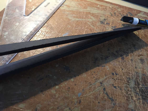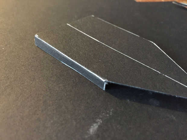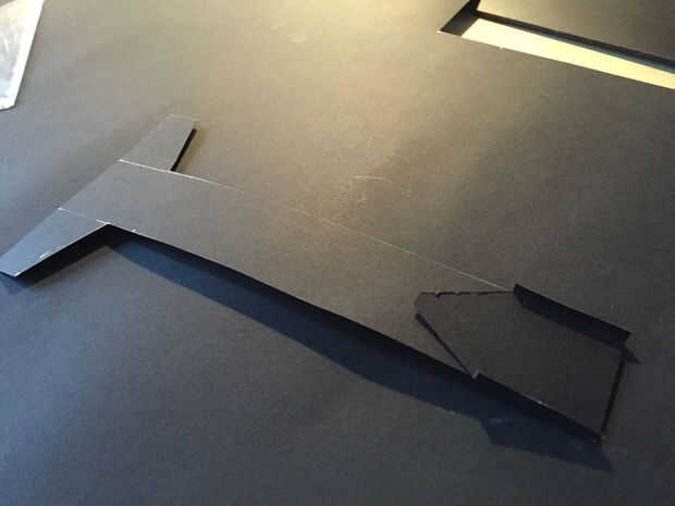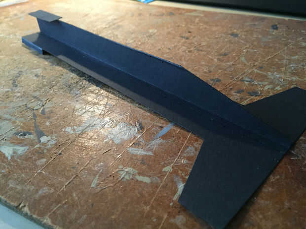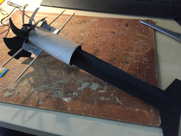 Fue hecho de papel grueso, una parte horizontal en dos verticales partes para aumentar la rigidez. Es todo pegan. La parte pequeña en la parte inferior de la parte horizontal de la cola fue hecha porque se nos olvidó añadir un borde plegable que podríamos utilizar para encolar al tubo. La longitud total es 25cm y 4 cm insertado en el tubo. La parte horizontal fue alineada con los pinchos para estabilidad (esperado) y luego pegada en el interior del tubo.