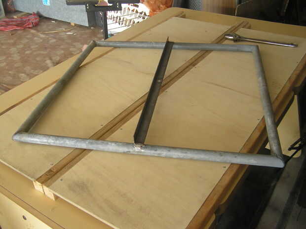 Estos marcos para sostener el eje del perno y simplificar la construcción. He utilizado tubo de 25mm. Añadir una sección de ángulo de hierro en el centro con un agujero perforado en el centro de poder tomar el eje de la rueda.