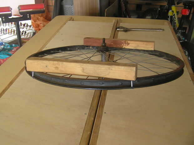 usé las ruedas de una vieja bici de carretera más allá de su uso por fecha. Recientemente he leído que una proporción del radio a la altura de 6-8 es más eficiente para las ruedas de una BMX probablemente sería mejor, pero usé lo que tenía. Para sostener el Savonius cubo base para la rueda de bicicleta fijar dos piezas de madera en los lados opuestos de la rueda para sostenerlas. Los hice el mismo ancho que la base de mi cubo, pero si se utiliza una base circular completo puede usar cuatro de éstos. Utilicé madera cuadrado de 35mm. Realmente he utilizado pino marcos de 70 x 35 que fue rasgado por la mitad.