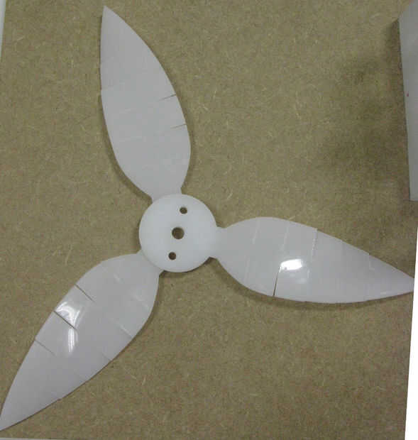 Ahora que usted puede ver donde deben línea, usando un adhesivo de plástico unen las cuchillas. (el orden es irrelevante siempre y cuando coincidan con los taladros)