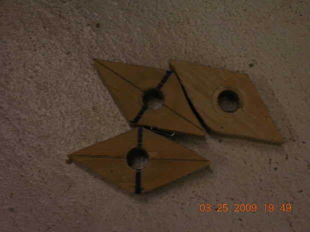 5. tres Forms(These are made by taking the interior diameter of the pipe (in inches) restando 1/2 pulgada a la longitud del formulario, agregar 1/2 pulgada en el diámetro de la barra para obtener el ancho y cortar la forma de diamante de 1/4 de pulgada a 1/2 pulgada de madera gruesa).
