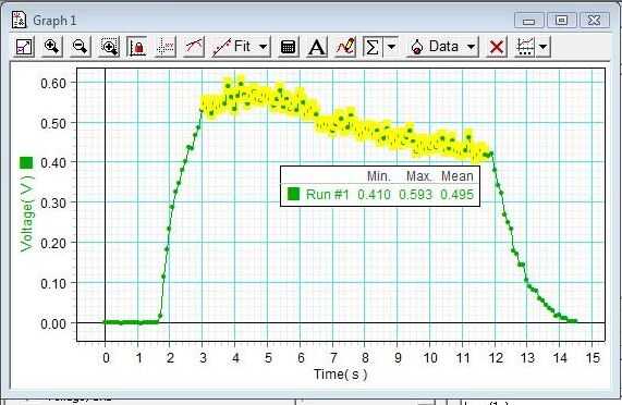 También pude utilizar Datastudio para medir el voltaje DC viene del generador. El equipo sólo mide hasta 10 voltios DC, usé un simple divisor de voltaje para escalar el voltaje de ser leídos por la computadora. Esto permitió a la computadora para leer 1/12 el voltaje producido. Así que la tensión real en el gráfico era 12 veces tensión leída por la computadora. Ver fotos del esquema. El voltaje en R2 debe ser 1/12 la tensión del generador, esto se muestra en el gráfico.
