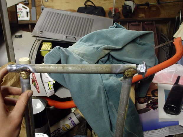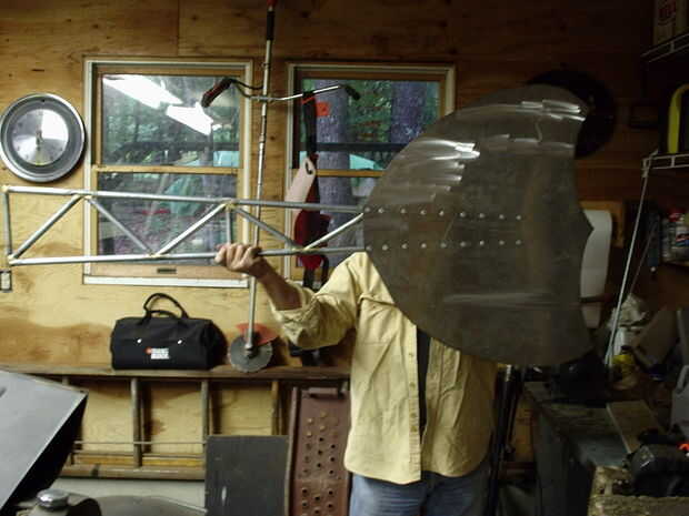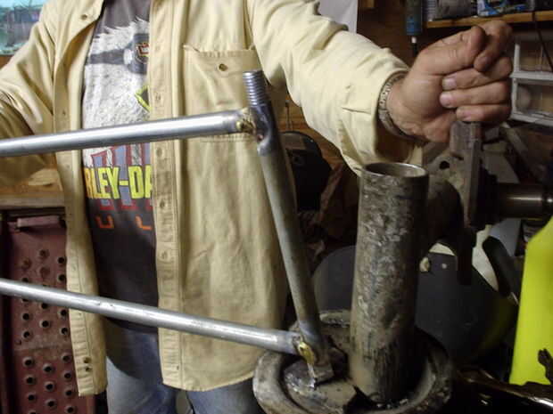 La cola es de tubería eléctrica y soldada juntos. Ponemos un montón de apoyo a pedazos en medio de ella para fortalecerla. La paleta de la cola se hace del acero inoxidable y se clava en la tubería.