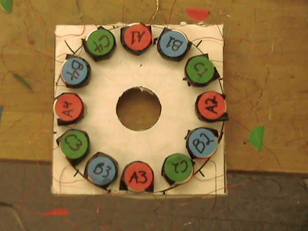 Una vez que, los tres restantes la soldadura termina juntos (las no soldadas de alambre grueso que debe pegarse de las bobinas "4"). Este es el punto neutro. En nuestro circuito, no será necesario acceder a este cruce otra vez, para que pueda cinta abajo o cualquier otra manera ocultar debajo de la base de las bobinas, junto con la excesiva longitud de las otras conexiones. De hecho, cuanto más usted puede hacer para poner en orden los cables, mejor. Una turbina funciona mal que sale de sus chuletas tiene una desagradable tendencia a agarrar cables expuestos y rasgar para arriba. Divertido reloj, pero el infierno para reparar.